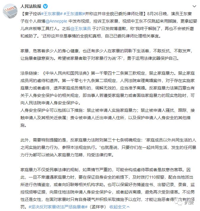 看了一下全过程,公开指控丈夫家暴应该不是王东妻子(微博账号 Annepple)的初衷,她是忍无可忍求无可求,绝望到底了才走的这一步。
