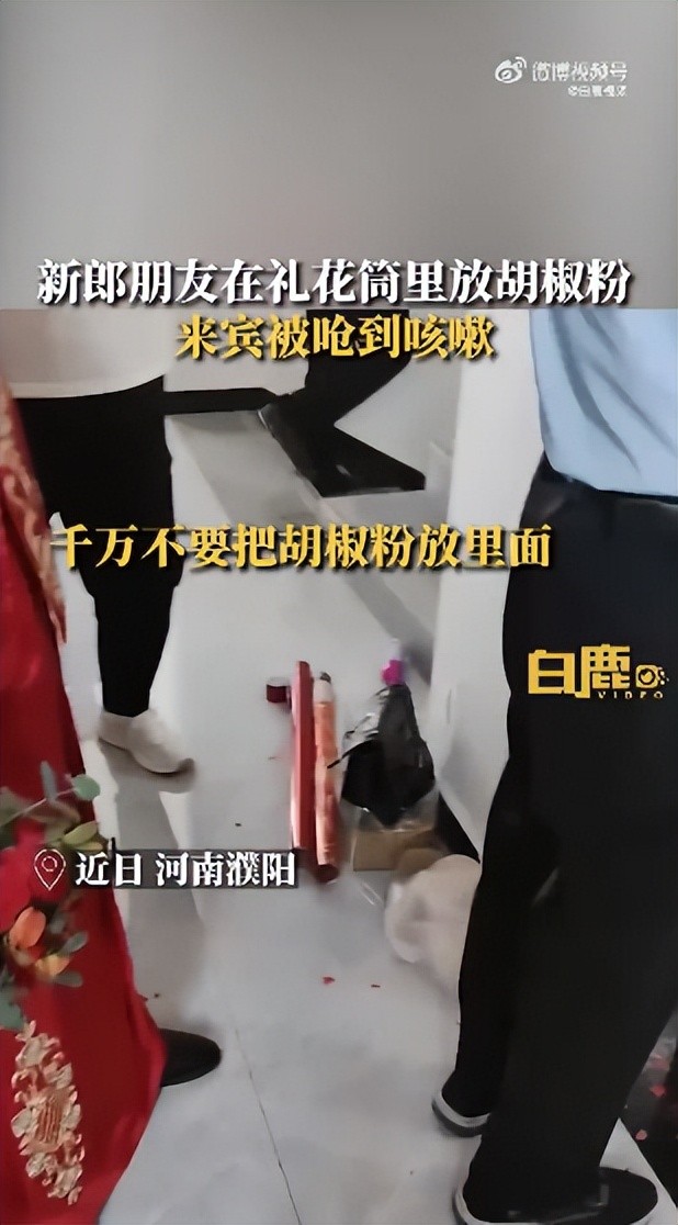 9月7日,据陕西网“白鹿视频”报道,近日,在河南濮阳,婚礼上,新郎的朋友在礼花筒里放胡椒粉,现场来宾被呛到不停咳嗽。