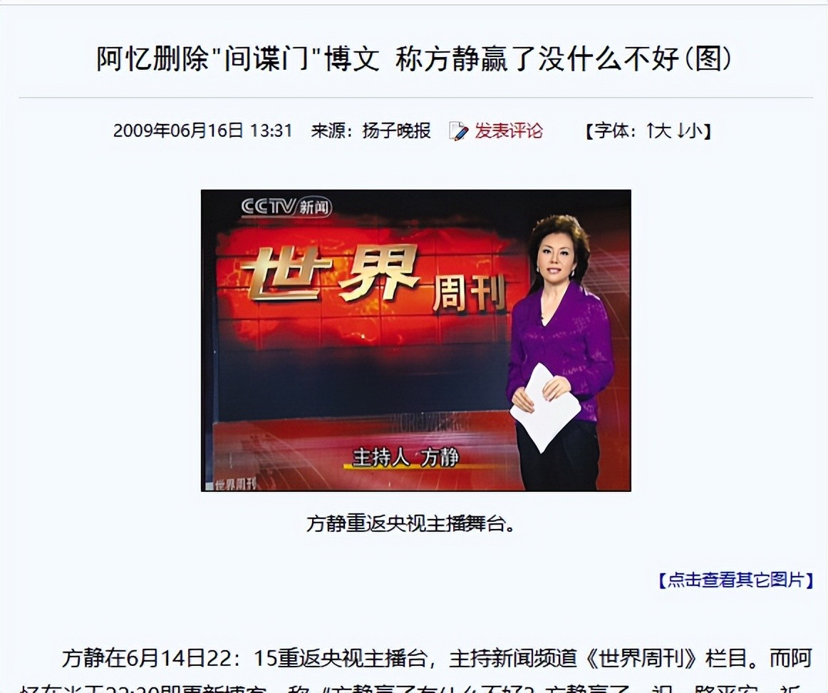 根据扬子晚报的报道,这个事情刊登于2009年6月16日发布的《阿忆删除"间谍门"博文 称方静赢了没什么不好(图)》