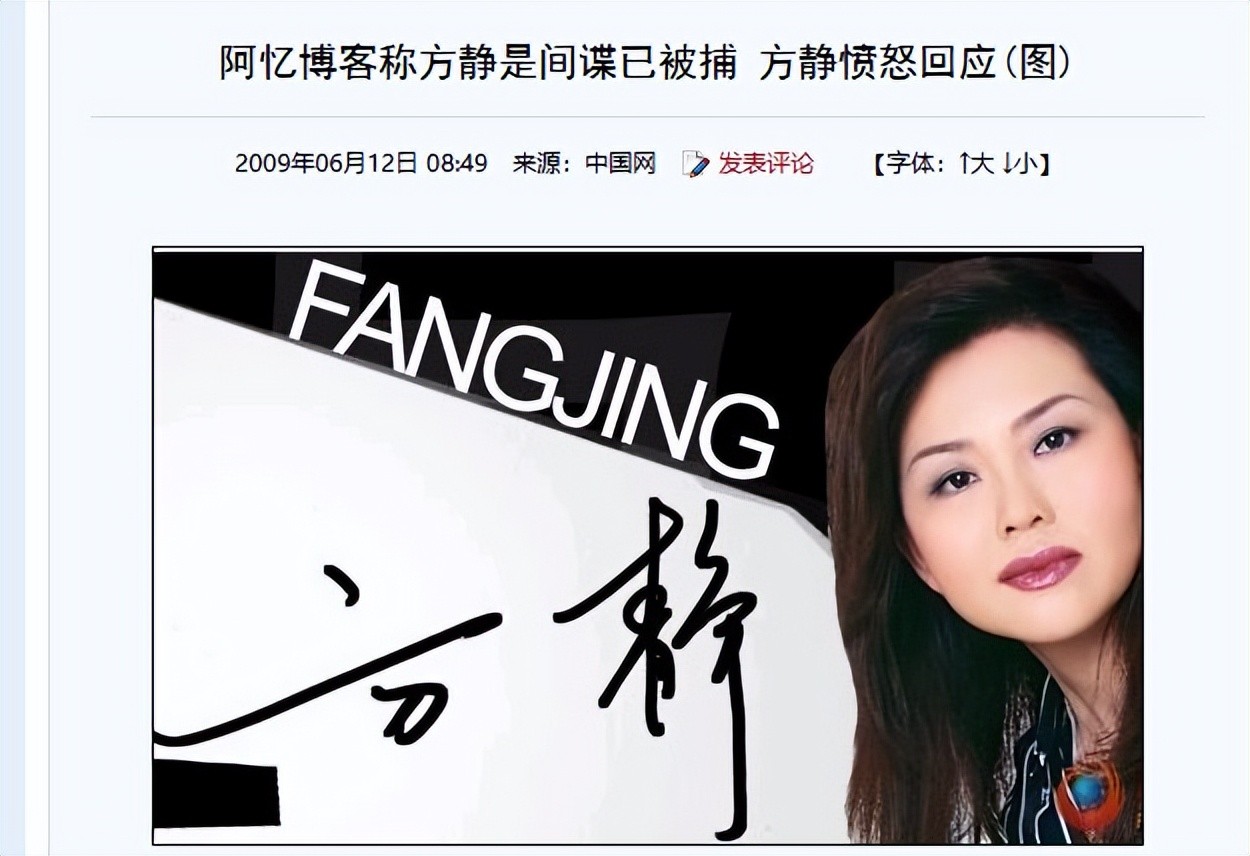 根据中国网的报道,这个事情刊登于2009年6月12日发布的《阿忆博客称方静是间谍已被捕 方静愤怒回应(图)》