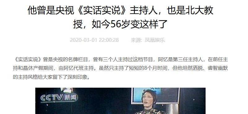 根据凤凰网娱乐的报道,这个事情刊登于2020年3月1日发布的《他曾是央视《实话实说》主持人,也是北大教授,如今56岁变这样了》