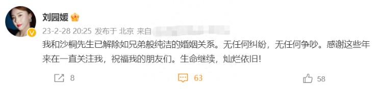 她在微博中写道:“我和沙桐先生已解除如兄弟般纯洁的婚姻关系,无任何纠纷,无任何争吵。感谢这些年来在一直关注我,祝福我的朋友们,生命继续,灿烂依旧!”