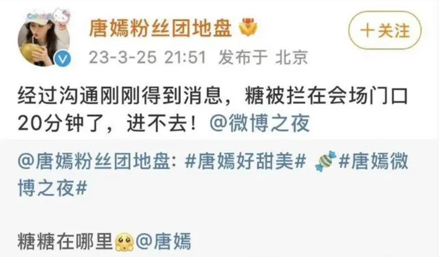 2023年的微博之夜,唐嫣没能赶上红毯,还被拦在门口。