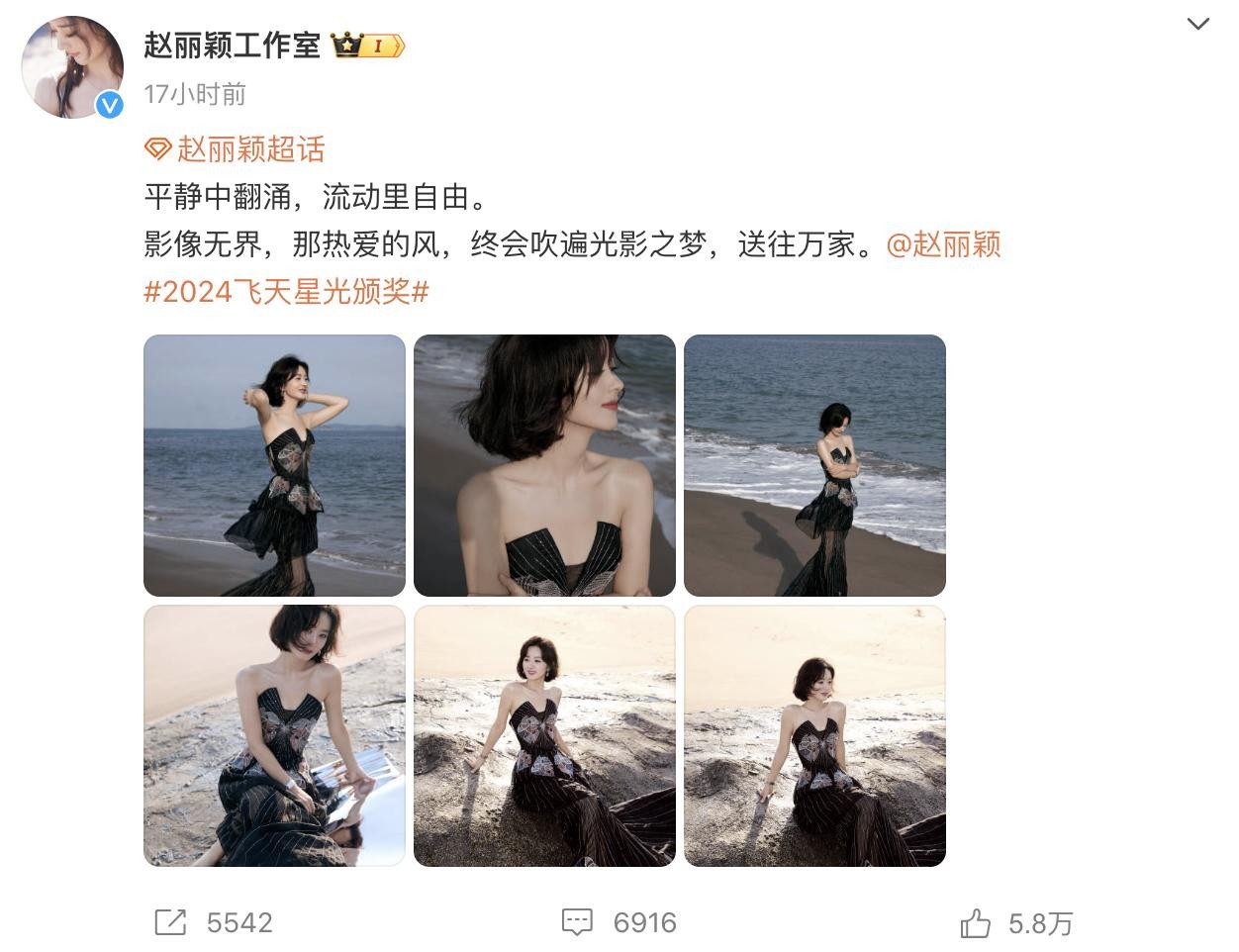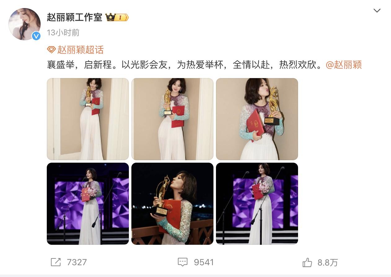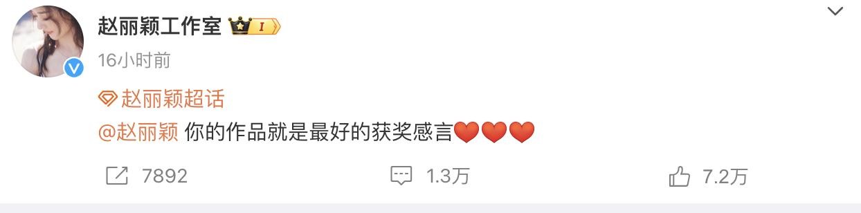 工作室发了一条,“你的作品就是最好的获奖感言”,帮赵丽颖挽回“获奖感言不充足”的缺憾。