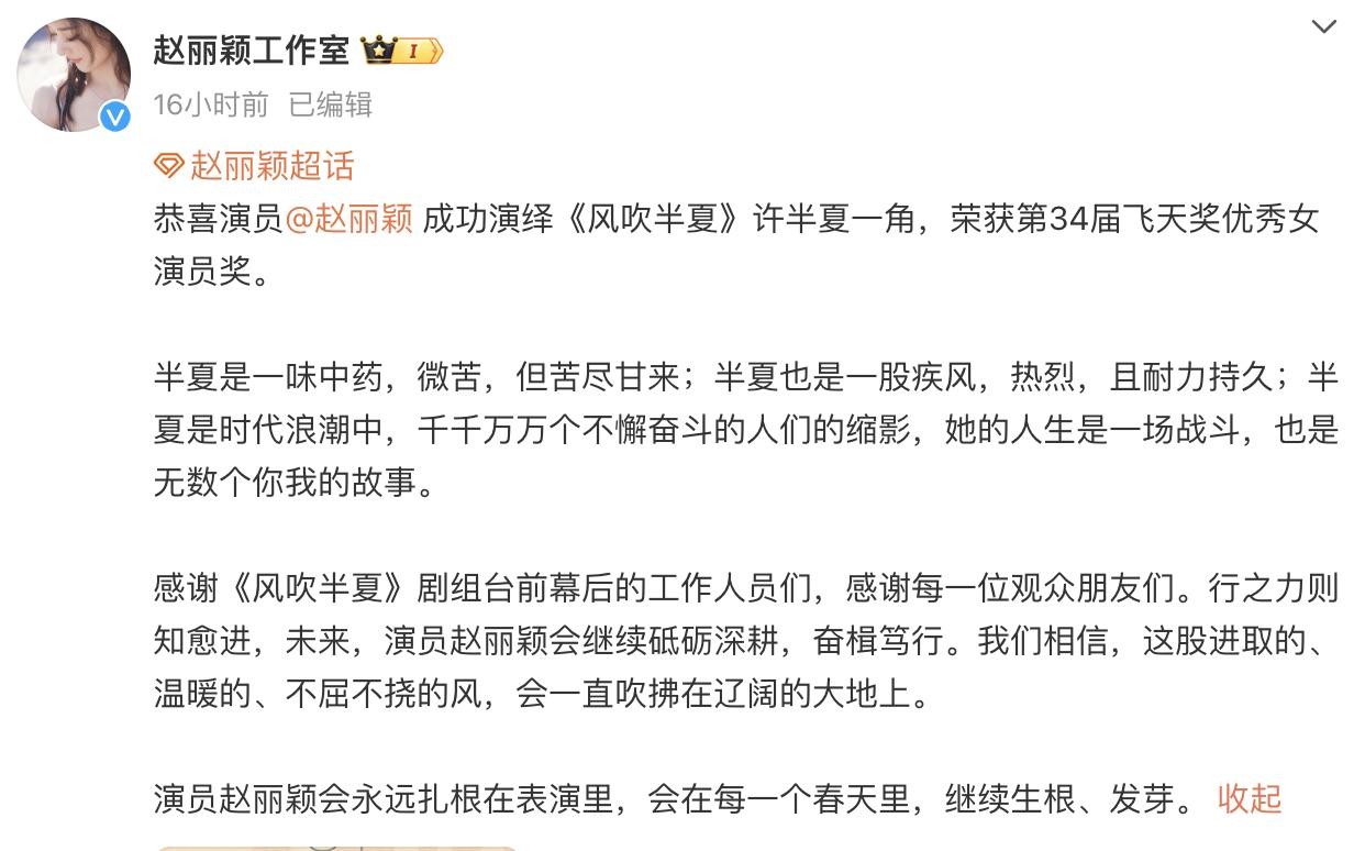 宣布赵丽颖获奖后,工作室第一时间跟进。