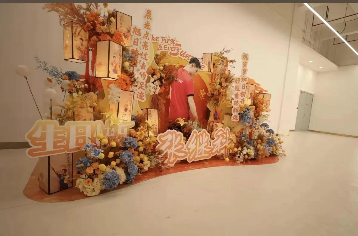 张继科工作的那个训练室门口呀,可被粉丝们给布置得满满当当的了。粉丝们弄了好几个生日会的背景墙呢,那花样多到让人看都看不过来呀。有那种用蓝橘色的气球和鲜花搭配着,旁边还特意放上一个乒乓球台的背景,看着就特别醒目,一下子就能吸引住人的目光。还有用蓝白色的鲜花和一闪一闪的小灯组成的背景呀,中间就摆着张继科的大照片,那氛围感一下子就营造出来了呀。更有意思的是橘调的背景呢,挂着灯笼,再加上鲜花,上面明明白白地写着“生日快乐,张继科”,就好像生怕别人不知道这是在给他过生日似的呀。光看着这些背景墙,就让人觉得呀,这场生日会肯定不一般,后面还会有啥厉害的招儿呢