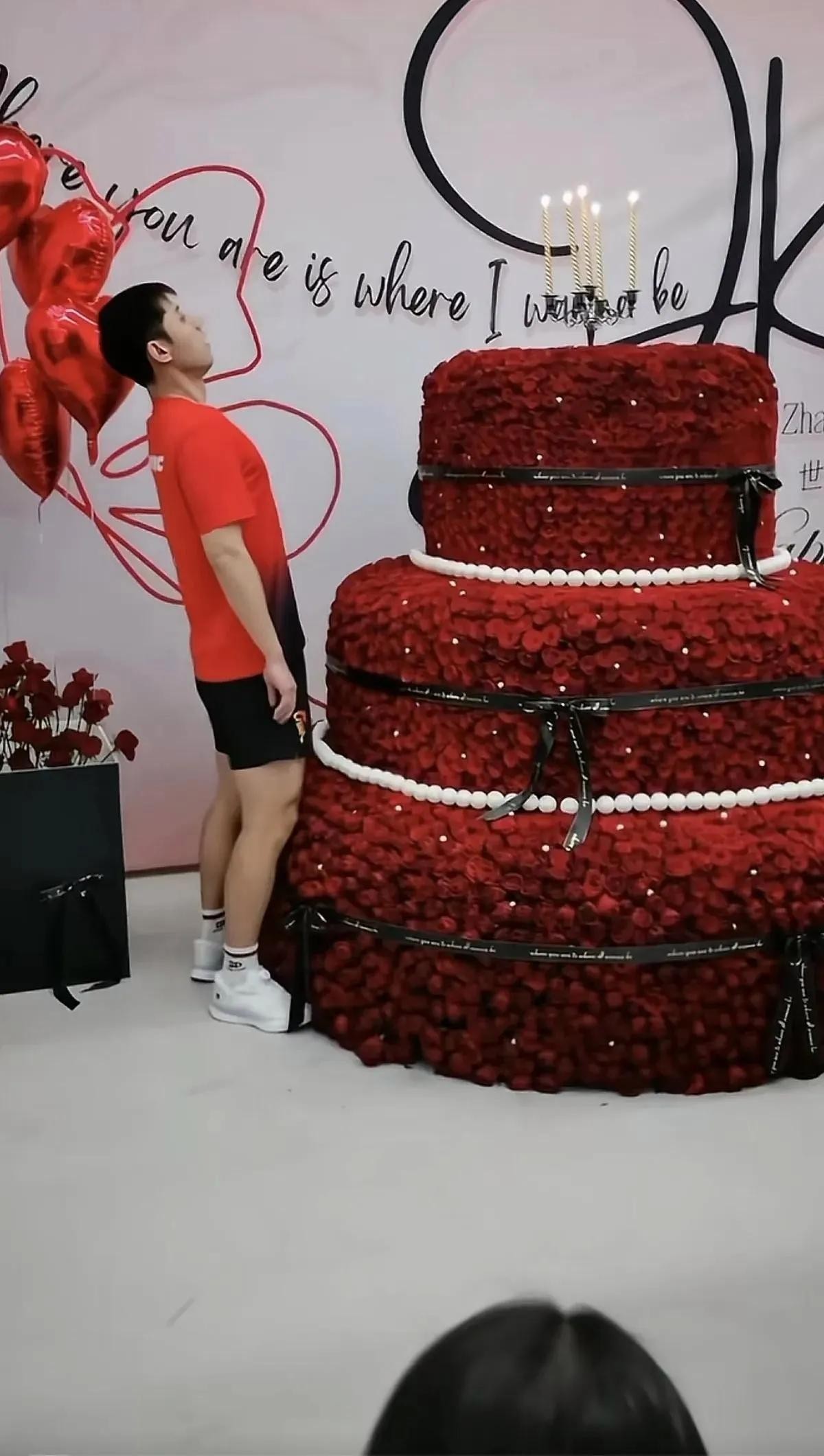要说这生日会的蛋糕呀,那可真是太厉害了。是个三层的大蛋糕呢,整个蛋糕从上到下全都铺满了娇艳艳的玫瑰花,看着就跟一座用花堆起来的小山似的。蛋糕周边不光系着精致的蝴蝶结丝带,那外圈还摆了整整两圈白色的乒乓球呢,看着就特别有创意。这蛋糕的个头可大了去了呀,张继科官方身高是1米81,哎呀,没想到这蛋糕竟然比他还高呢,将近1米81的高度呀,浑身还插满了玫瑰花,那场面,就跟一座玫瑰城堡一样。而且这些玫瑰花可不普通呀,据说用的都是顶级的高原红玫瑰花,光批发价一朵就得6块钱呢,这6000朵加起来,光是玫瑰花的成本就好几万了呀。还有那两圈乒乓球也都是赛级的,一颗就得12到25元呢,这成本那是一个劲儿地往上涨呀。蛋糕最顶端插着蜡烛,张继科站在那儿想吹蜡烛,根本够不着呀,还得跳起来吹呢,你说有意思不。不过呀,粉丝们心思还挺细的,又准备了几个正常大小的蛋糕,其中有个小蛋糕跟那个大玫瑰花蛋糕长得差不多,连上面的蜡烛都一模一样呢,就是为了让张继科吹蜡烛能方便点儿呀,这粉丝的爱也太实在了呀,可这蛋糕到底花了多少钱呢,真的是让人忍不住一直琢磨呀。