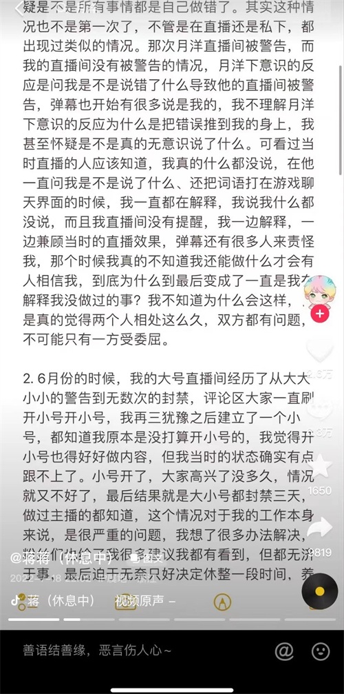 众所周知,蒋蒋是比较腼腆的性格,因为淘汰分的事情,让月洋和月洋的粉丝感觉到不被蒋蒋尊重。因此月洋表示要分开直播,蒋蒋也表示同意。大家虽然对这件事情表示非常遗憾,但粉丝们也没有做过多的动作,但没想到十几天之后,月洋开播花40分钟控诉蒋蒋冷暴力,月洋方粉丝开始攻击蒋蒋以及他的粉丝,逐渐上升高度,一些小号开始乱带节奏,甚至扒出蒋蒋的私人信息和所谓的“黑料”。蒋蒋受到了巨大的打击,心态也无法接受这件事情,因此选择了停播。