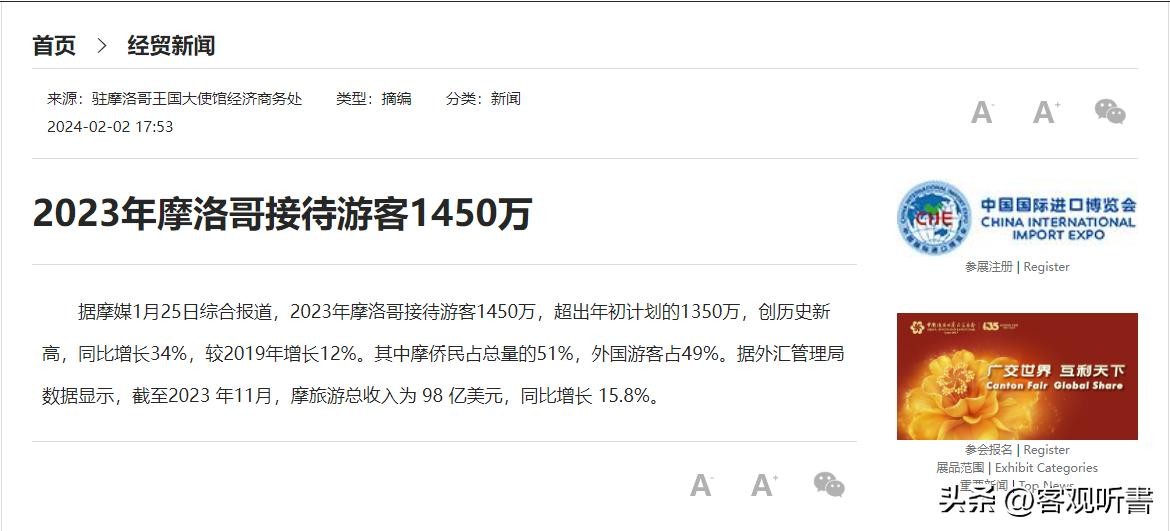 2023年摩洛哥接待游客1450万.驻摩洛哥王国大使馆经济商务处.2024-02-02 17:53