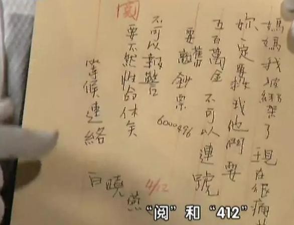 后来白冰冰去了绑匪说的地方,找到了绑匪放在那里的东西,还有白晓燕的亲笔信,内容是自己被绑架了,要500万美元赎金,而且要求不能报警,否则会有生命危险。