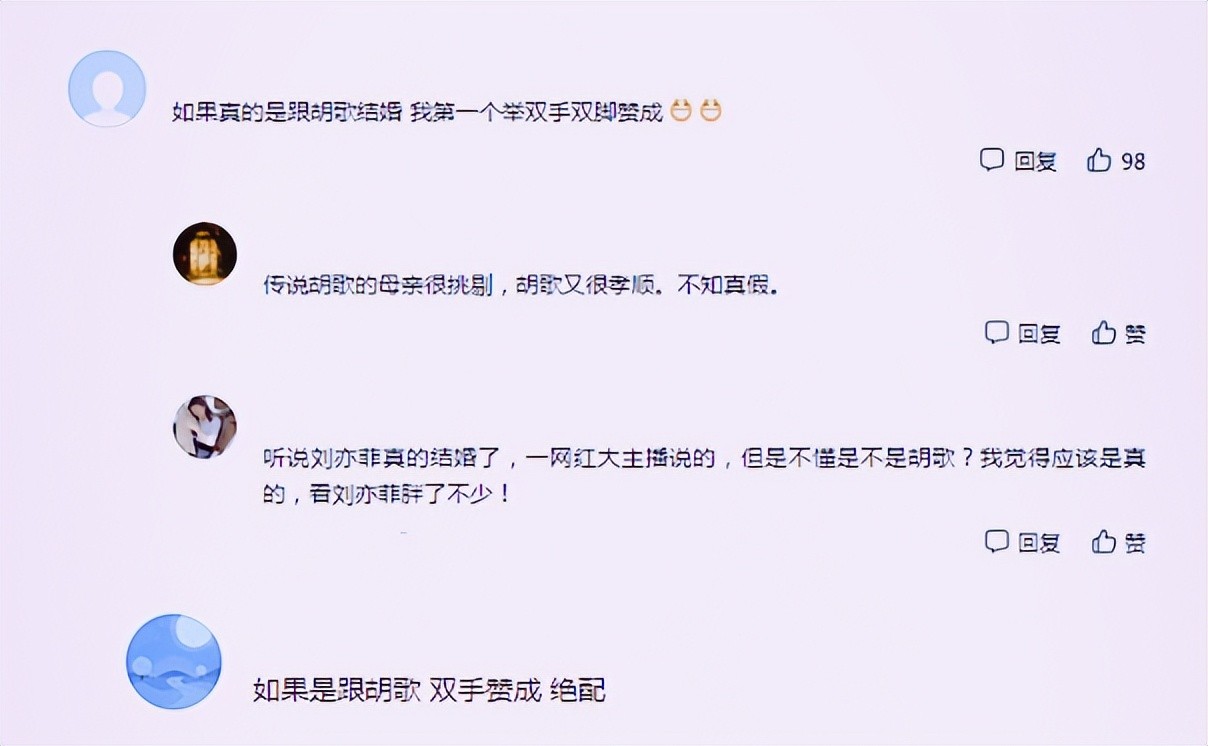 网友们知道了这件事情后,反倒是更起劲了,还纷纷留言“若刘亦菲结婚,新郎官是胡歌的话,就举双手赞成”,也有人说“刘亦菲和胡歌是绝配”等。
