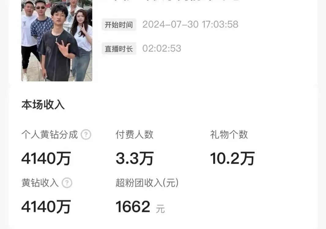 此外,据祁天道公开的直播收入截图显示,其在7月30日的单场直播收获3亿次点赞、10.2万件礼物,个人黄钻收入达到4140万。据快手官方客服,目前兑换比例为200黄钻=1快币=0.1元,以此估算,祁天道单场直播礼物收入为2万元。