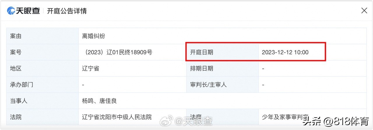 而从辽宁省沈阳市中级人民法院对外公开的开庭公告显示,杨鸣和妻子唐佳良的离婚案也将于今年12月12日上午10点正式开庭。