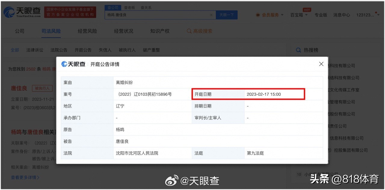 据天眼查消息,从沈阳市沈河区人民法院对外公开的开庭公告显示,今年2月杨鸣曾因离婚纠纷起诉过妻子唐佳良,该案2月在沈阳市沈河区人民法院开庭。