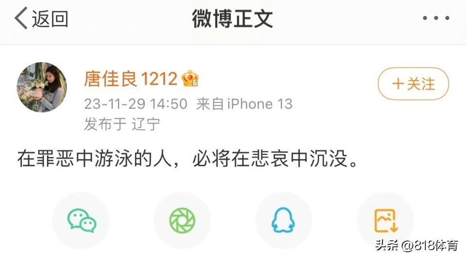 直到2023年11月29日,杨鸣的妻子唐佳良突然更新了个人微博写道:“在罪恶中游泳的人,必将在悲哀中沉没。”