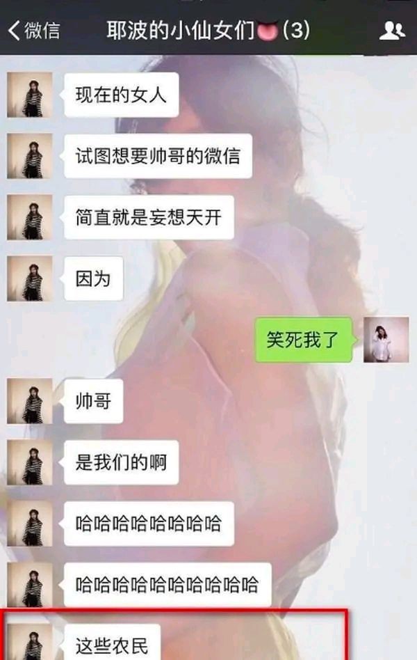 男人喜欢聊美女,其实女人也喜欢聊帅哥,王文也在自己的闺蜜群里大言不惭地说帅哥都是自己的,这都不重要,重点是她最后说普通人都是农民,很明显带着轻蔑的口吻看不起别人,一副高高在上的嘴脸。