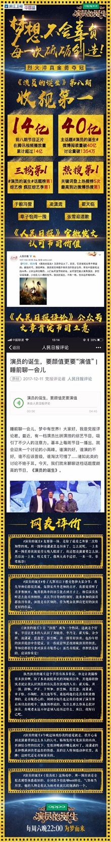 除了播放量和讨论度成绩喜人,百余个微博大号和公众微信号,也在《演员的诞生》播前、播中和播后持续为节目点赞,如“腾讯综艺”、“新浪综艺”、“音乐八卦”、“星揭秘”、“八组兔区热议”“芒果捞小丸子”、“辣条娘”、“娱社长”、“娱公子”、“传娱乐圈新鲜事”、“韩饭桶”、“电视节目创新引擎”“电视圈大哥”“电视眼”等。