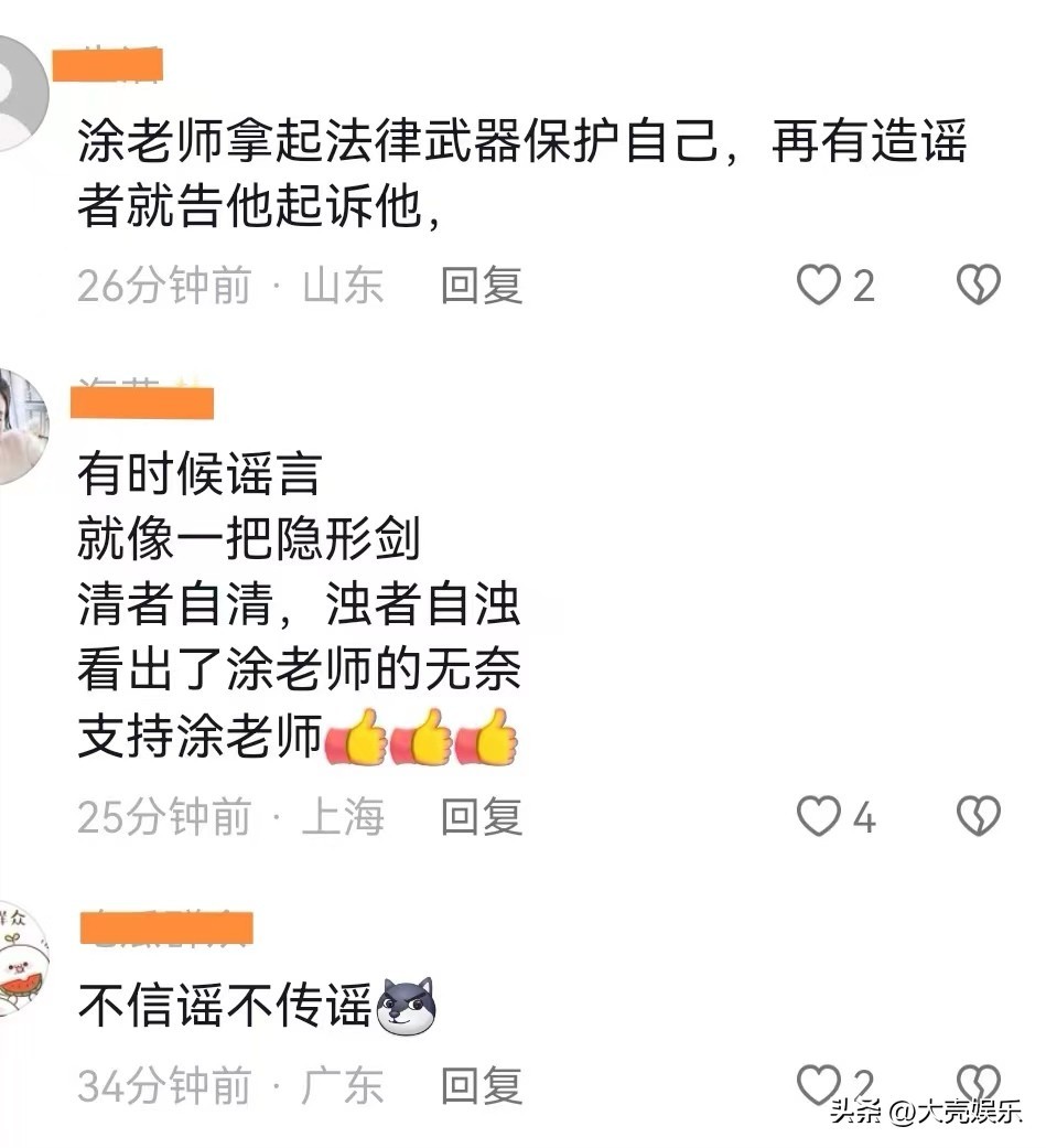 很多网友纷纷在评论区留言,他们相信并支持涂磊老师,并希望涂磊能够拿起法律的武器保护自己,严惩造谣者。