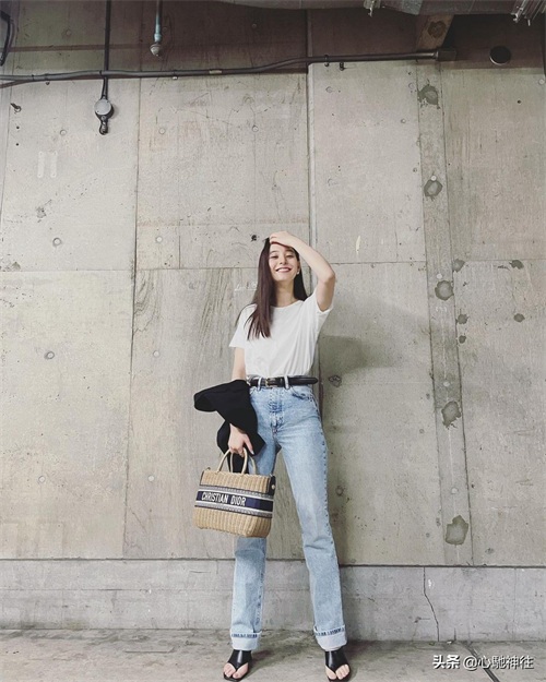 白色简约T恤搭配高腰牛仔长裤,有了黑色腰带的加持,更加时尚有型。黑色的夹脚凉鞋能够让穿搭更养眼,更有高级感。