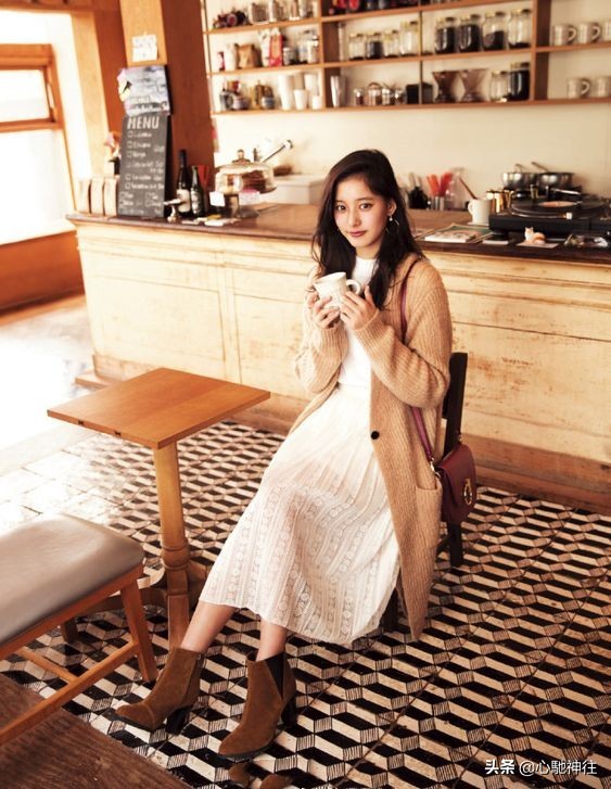 生活中的新木优子,一袭白色的连衣裙,小高领的设计复古又甜美,外搭一件咖啡色的长款开衫,脚踩棕色短靴,温婉又显文艺范。