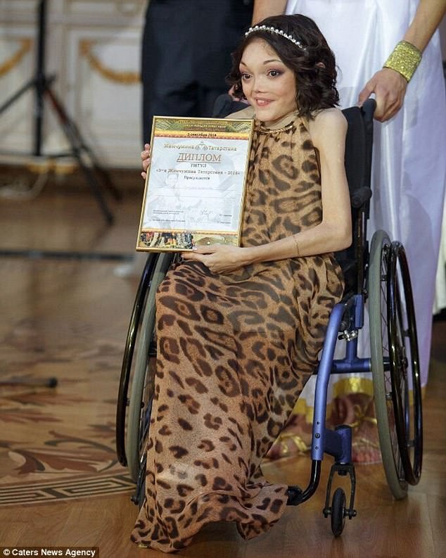 丽莉来自俄罗斯的鞑靼斯坦,因为患有一种复杂的遗传疾病,她的骨骼发育异常,脸与身体都显得很不对称,并且脊椎与腿部变形,只能坐在轮椅里。