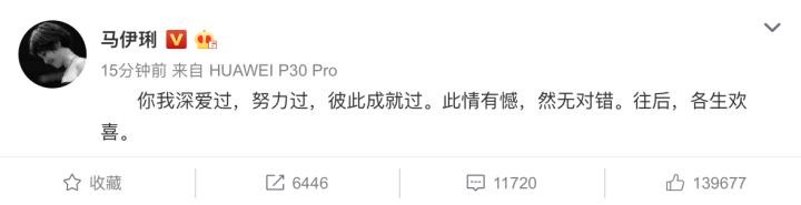 微博中,文章表示,“吾愛伊琍,同行半路,一别两宽,餘生漫漫,依然親情守候。”随后,马伊琍并未转发文章的微博,而是单独发布微博,官方回应了离婚消息,称:“ 你我深爱过,努力过,彼此成就过。此情有憾,然无对错。往后,各生欢喜。”
