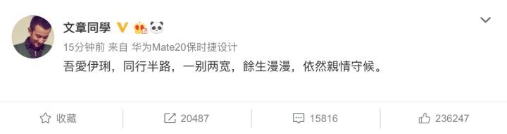 今天下午,演员文章突然在微博发布消息,正式公开已与妻子马伊琍离婚。