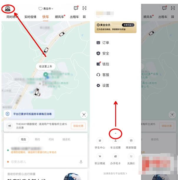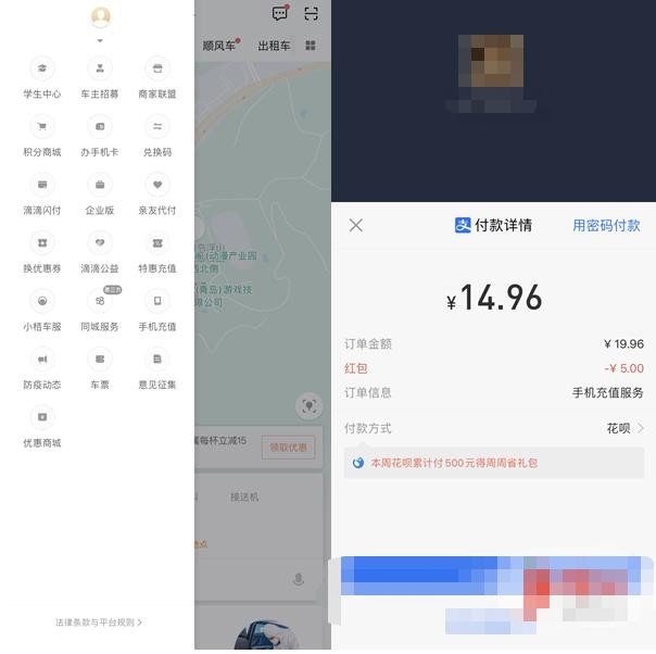 3、打开滴滴出行App→点击左上角头像→点击向上箭头或者上滑找到"手机充值"→输入手机号充值,支付选择支付宝即可(如果没有立减就别充了)
