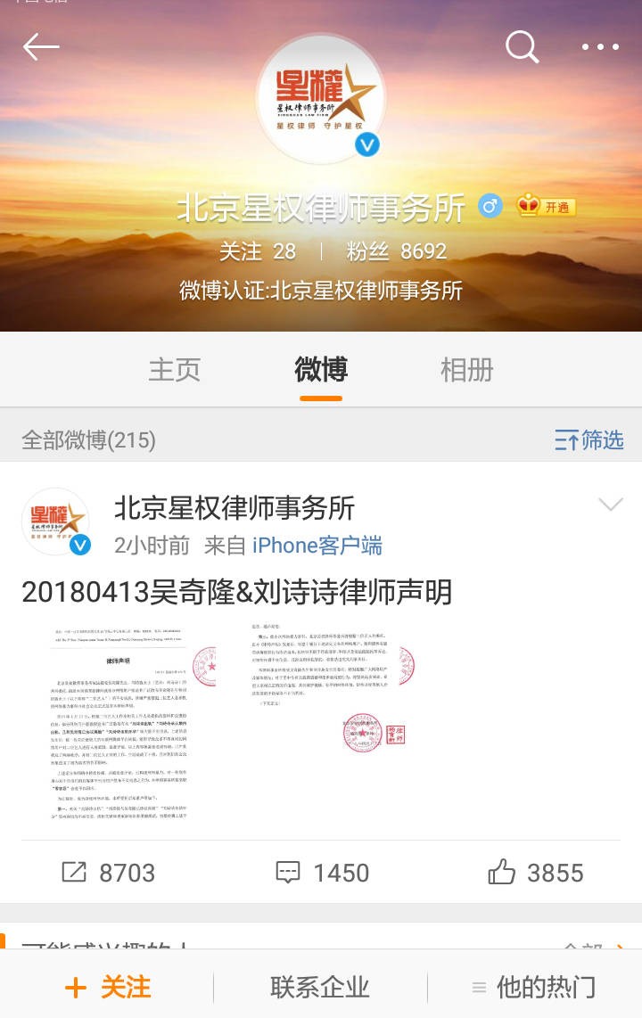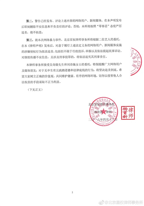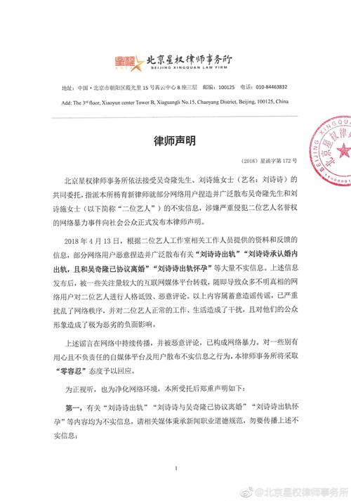 4月13日下午,吴奇隆刘诗诗 委托律师发表声明,表示有部分网友恶意捏造并散布有关“刘诗诗出轨”、“刘诗诗承认婚内出轨,且与吴奇隆协议离婚”等不实内容,严重扰乱网络秩序,对艺人的工作、生活造成干扰。要求侵权用户删除不实内容,且将依法追责侵权用户。网络暴力何时休,希望在盈利的情况下有底线,不要歪曲事实,用谣言伤害别人。