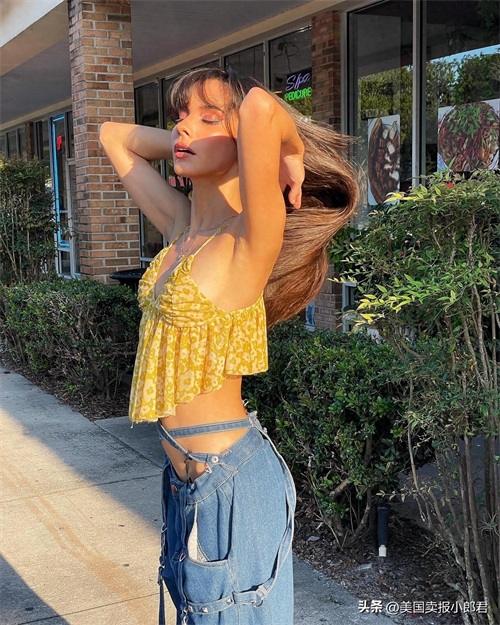 女子散发着洒脱与自信的气质,她身穿一件明亮的黄色吊带上衣,图案清新俏皮,与阳光完美呼应,充满夏日气息。紧身牛仔裤的设计展示出她修长纤细的身材线条,随意垂下的腰带增添了一份不拘一格的个性。她微闭双眼,脸上浮现出一种沉浸于阳光与微风中的自在与恬淡,仿佛在享受片刻的放松。披散的长发随风轻扬,阳光洒在发丝与肌肤上,勾勒出自然的光影效果,为她的美增添了一份灵动与生机。整体形象既有现代的率性,又不失柔美与优雅,展现了一种极具魅力的独立女性气质。