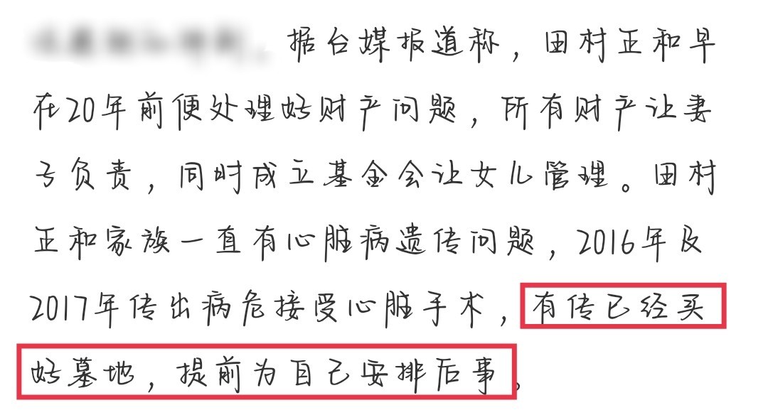 有报道称田村正和在20年前就处理好了财产问题,所有财产让妻子负责,同时成立基金会让女儿管理。据传闻,田村正和生前已经买好了墓地,为自己的离世做足了准备。