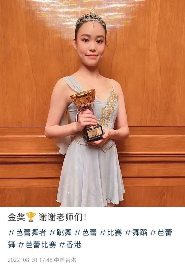当然最主要的还是庆祝自己拿到了国际芭蕾比赛的金奖,穿着舞蹈服的她身姿挺拔,仪态非常优美。