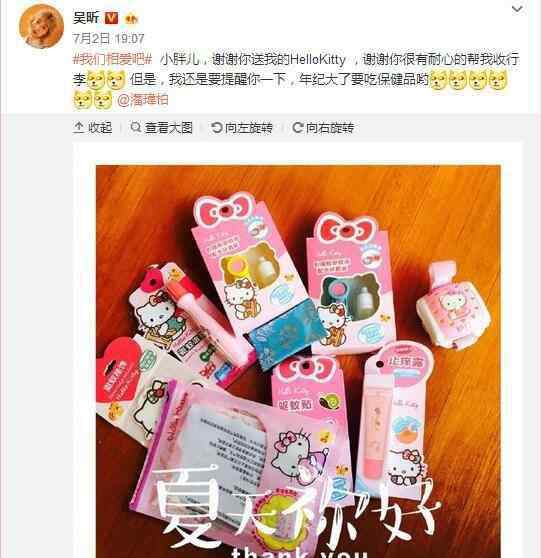 该段节目也在2日晚间播出,两人还不忘在微博上隔空放闪,吴昕晒出两人在节目中的截图,以及潘玮柏送她的所有Hello Kitty物品,开心地表示,“小胖儿,谢谢你送我的Hello Kitty,谢谢你很有耐心地帮我收行李。但是,我还是要提醒你一下,年纪大了要吃保健品唷。”然而照片中最引人注目的是一张两人表情同步的画面,两人嘟嘴的样子十分相似,因此引来不少网友直呼,“好有夫妻脸”。