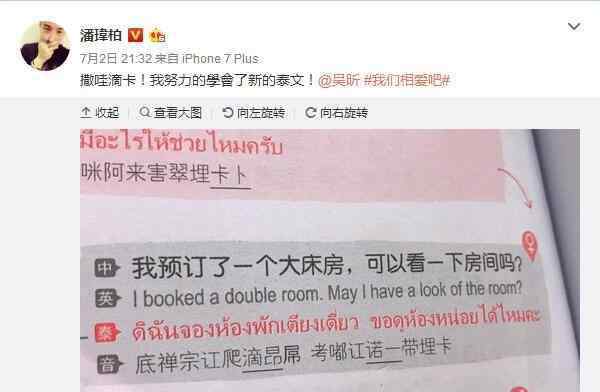 昨日(7月2日),“无尾熊CP”部分播出第二集,潘玮柏和吴昕也在微博上隔空放闪。吴昕po出一张两人表情神相似的照片,潘玮柏也搞笑地称自己有在认真学泰文,看得粉丝们直呼“无尾熊CP太甜了!”