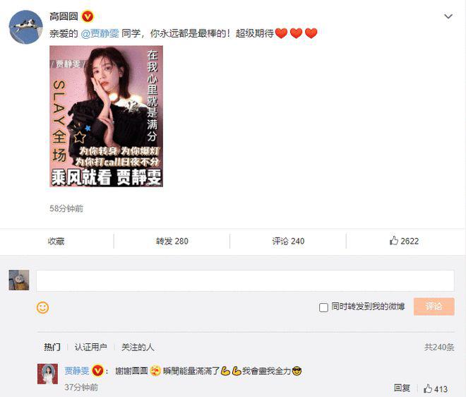 贾静雯也在评论区回应高圆圆:" 谢谢圆圆,瞬间能量满满了,我会尽我全力。"