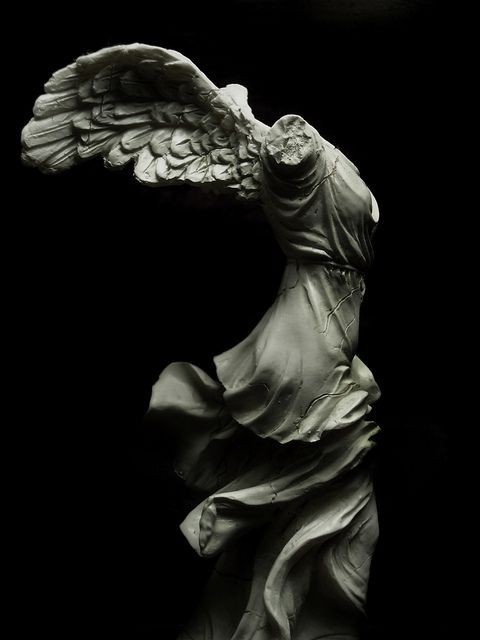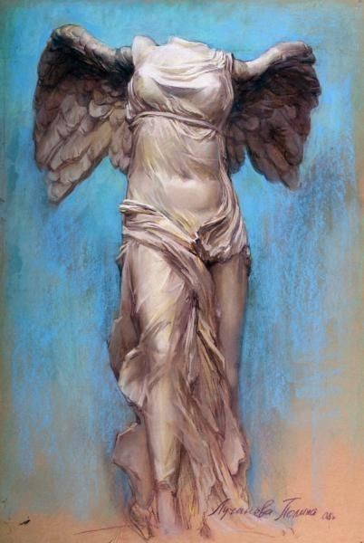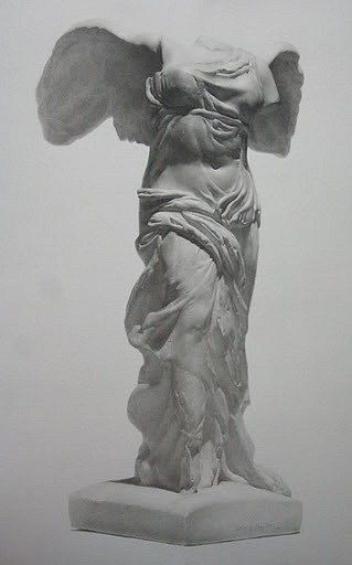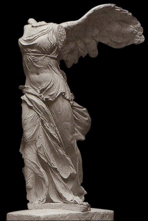 雕像屹立海边山崖之巅,迎着海风,那前倾展翅欲飞之态,被海风吹拂的衣裙贴着身体,可隐见女性人体的完美,衣裙褶纹构成疏密有致生动流畅的运动感,呈现出生命的飞跃。希腊雕像充满着生命,即使残缺也是活物,人们在想像中弥补了残缺,获得了完满的审美享受