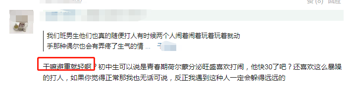 但是当行为超出让人不舒服的范畴,那么就是否可以稍微反思一下自己做得到底对不对?打闹可以,但是单方面的“殴打”就不行,不管是什么身份,和谐相处的基础就是尊重。