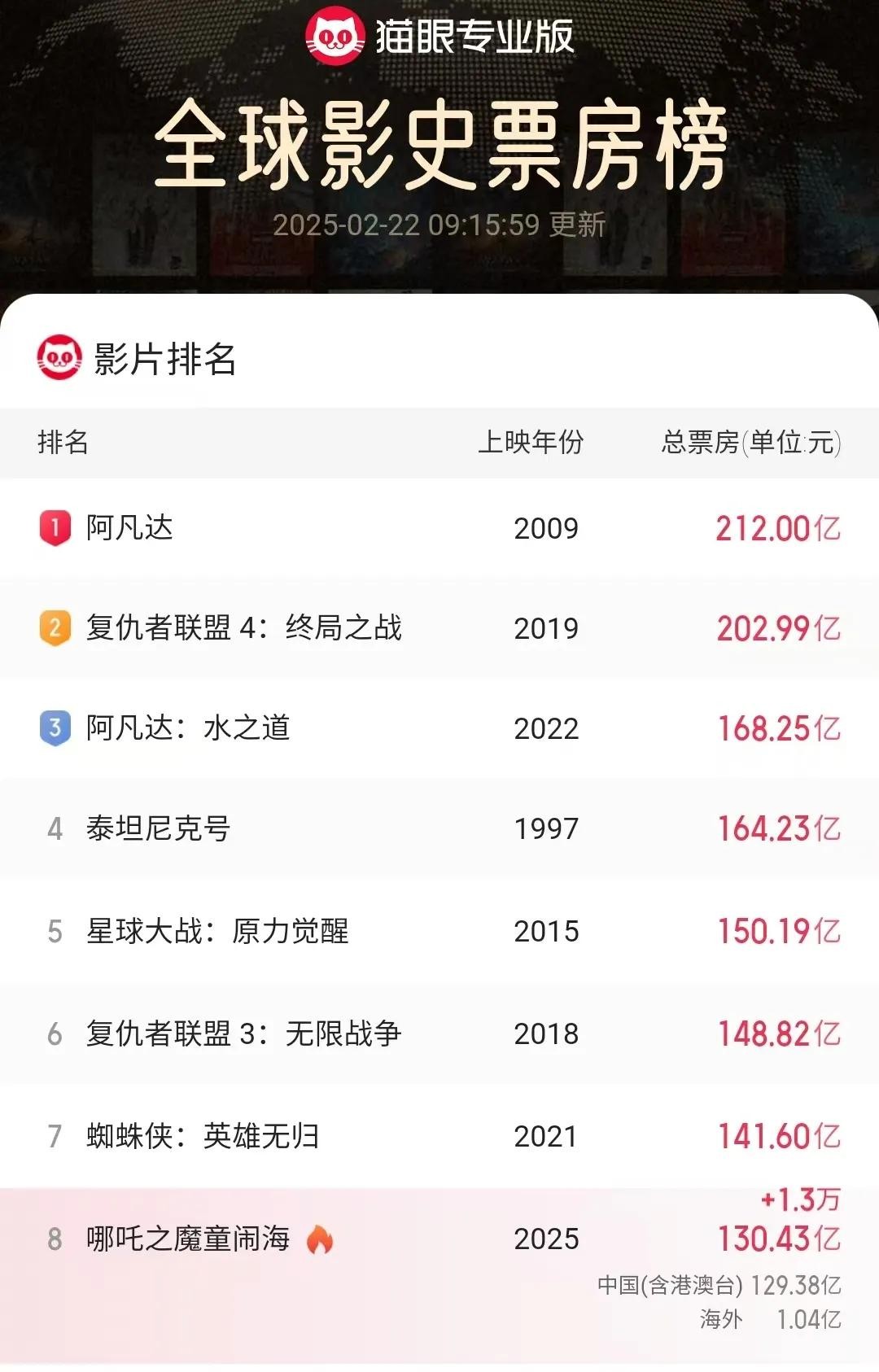 2月23日最新数据显示,影片票房达136亿元,全球排名升至第8位,周末单日票房增长超6亿元,展现强劲后劲。