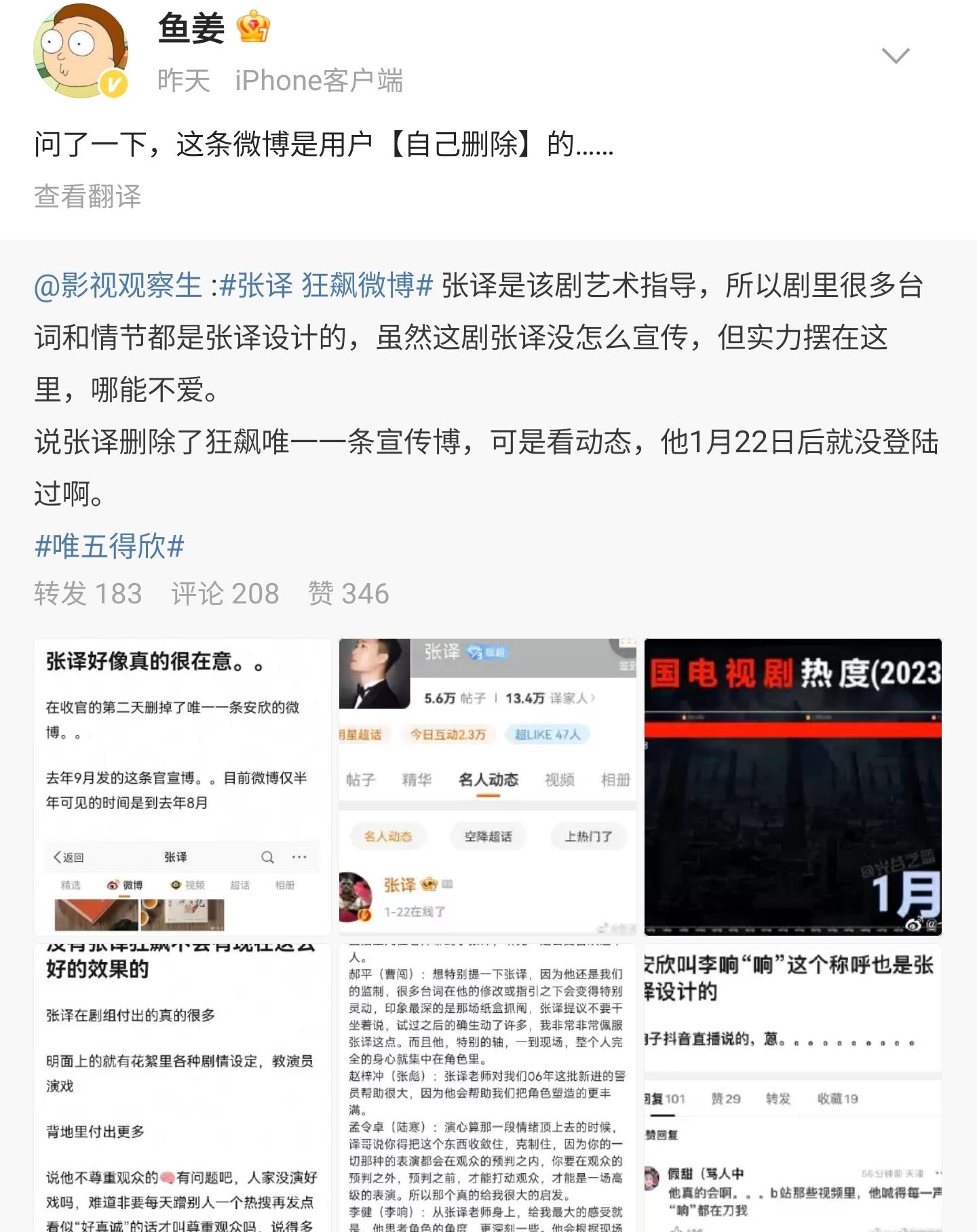 在《狂飙》播出完的当天,张译在个人账号删除了唯一一个宣传“安欣”的文案,让张译和《狂飙》剧组的矛盾迅速激化,有网友发文力挺张译,要求《狂飙》剧组给张译一个合理的解释,质问《狂飙》剧组到底怎么伤害了张译,让一个平时口碑这么好的演员,会生气到删除去年发布的唯一一条和《狂飙》有关的内容。