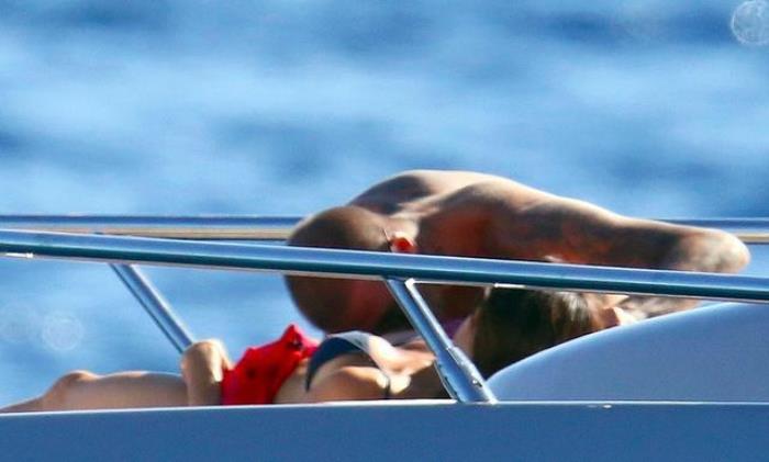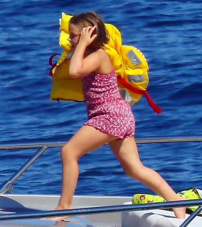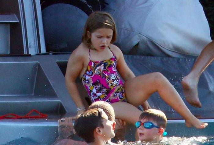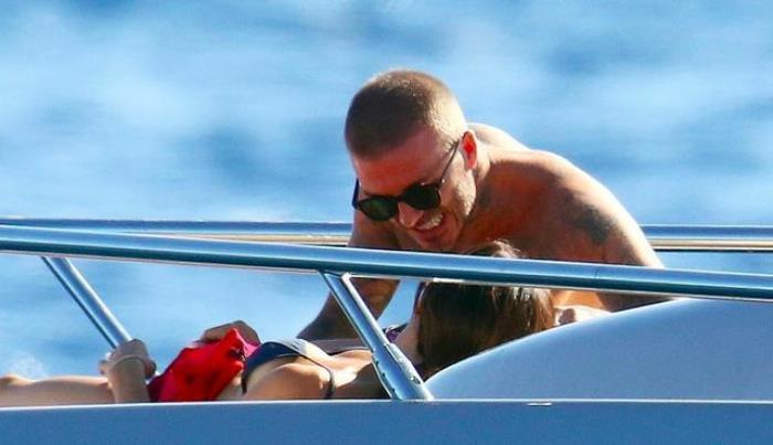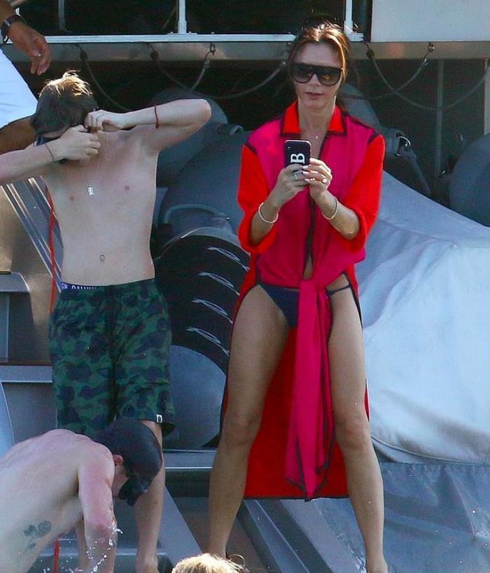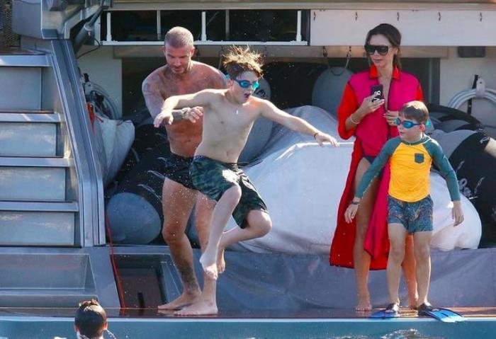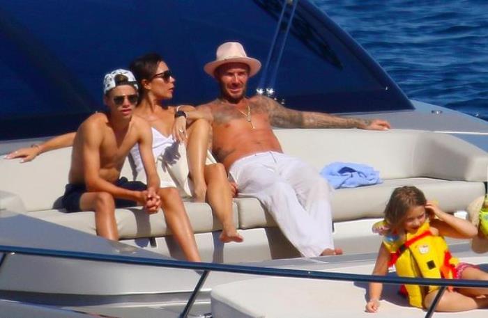 9月3日,贝克汉姆带着妻子和儿女,一家人来到法国南部度假。自从布鲁克林退学回家后,小贝就经常带着全家出游。当天一家人坐着游艇出海,贝克汉姆和三个儿子均赤膊上阵,小七和贝嫂则穿着吊带泳衣,愉快地玩水。