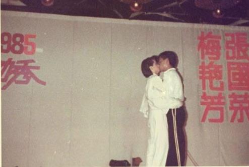 这是在张国荣跨越97的演唱会上,张国荣手捧鲜花走到梅艳芳面前,给了她深深的一吻,好像久别重逢的恋人。