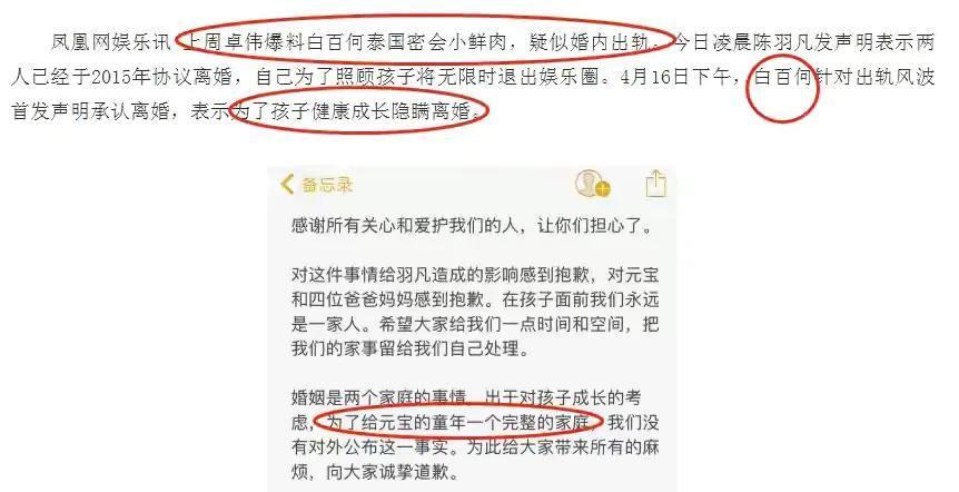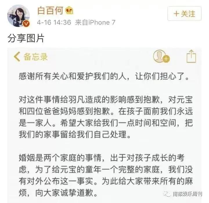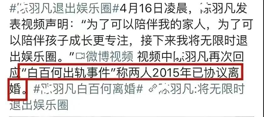 2017年4月16日,陈羽凡才公开声明,他与白百何已经于2015年年底离婚。
