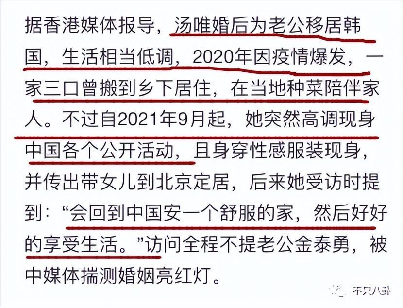 港媒是如何推论的呢?原来,汤唯婚后和金泰勇去了韩国生活,2020年疫情后,一家三口搬到乡下居住。