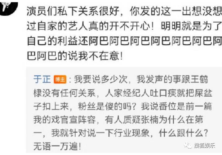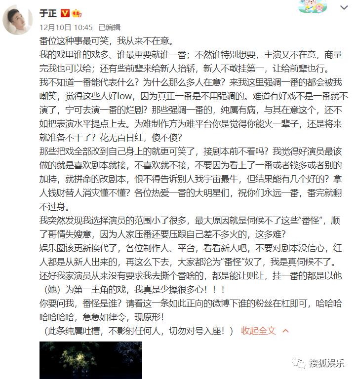12月13日,于正回复网友评论,回应有关番位长文的争议 称和王鹤棣没有任何关系↓