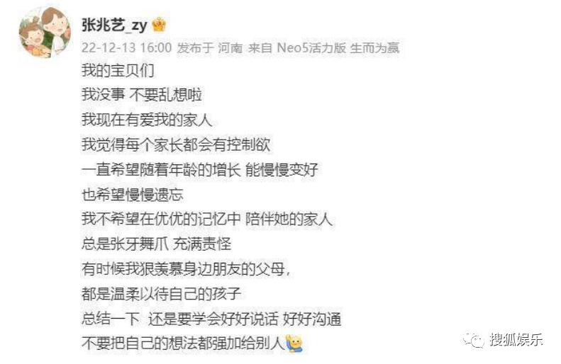 今天,她发文回应称“我没事,不要乱想啦”,表示每个家长都会有控制欲,总结要学会好好说话,好好沟通,不要把自己的想法都强加给别人。