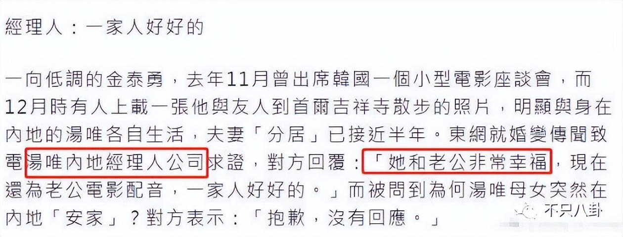 只是被问到为何汤唯母女会搬回内地生活,公司则拒绝回应。