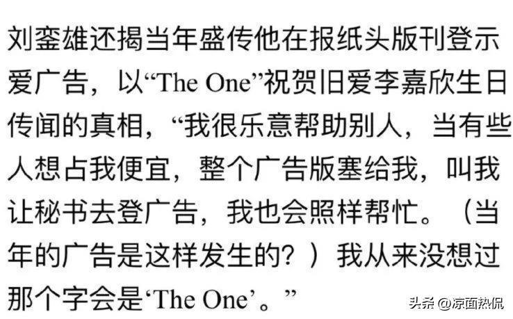 这个The one来自2006年李嘉欣生日那天,刘銮雄买下了报纸整个版面为其庆生,落款直接就是“THE ONE”