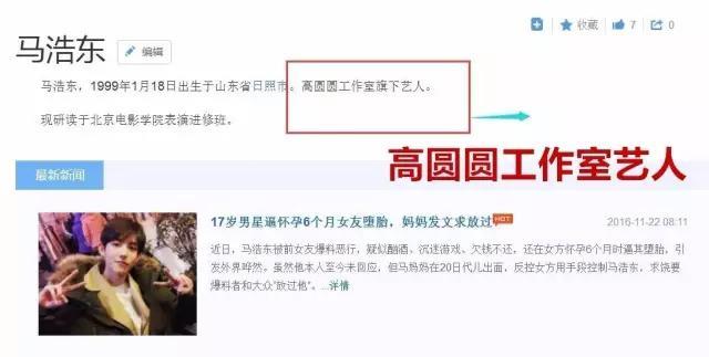 他以前是快手上的小网红,在百度百科上的介绍还不足50字,介绍最多的就是他【17岁逼女友堕胎的事情】,然而他最大的标签就是——高圆圆工作室旗下艺人!