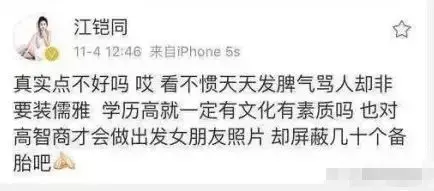 学位掺水的烂摊子还没收拾完,这下,又被网友翻出他被前女友江铠同早在2016年微博秒删的一条diss的微博。