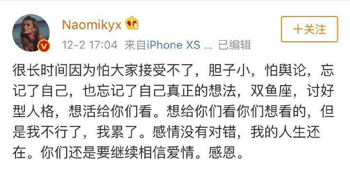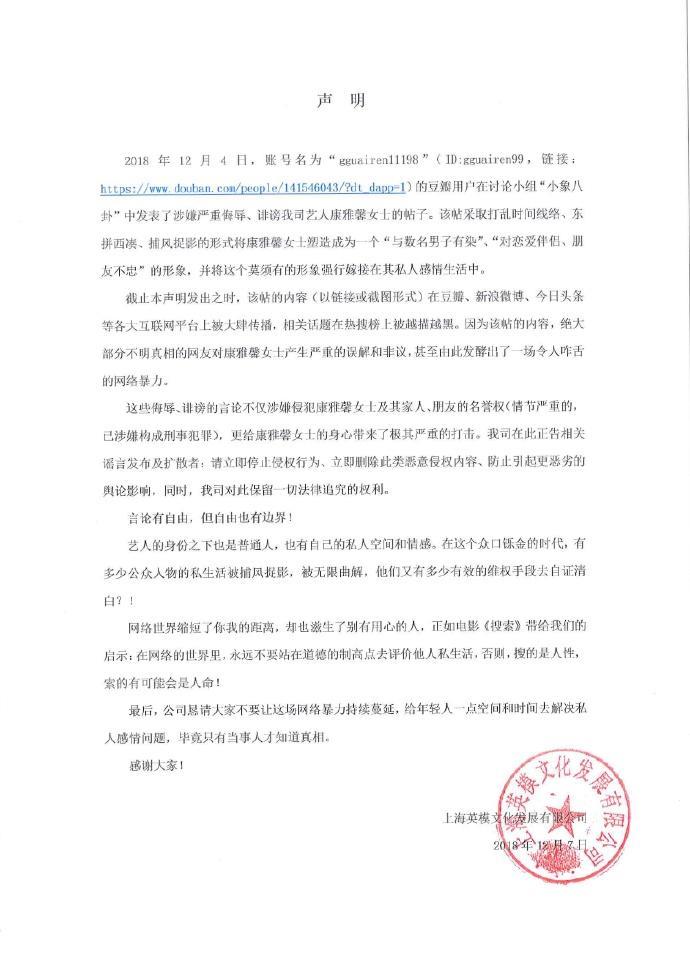 就在昨天(12/7),naomi经纪公司发表声明,否认了一系列网络传闻,并称网友的爆料采取了打乱时间线、东拼西凑的形式,将康雅馨(naomi)塑造成了一个“与数名男子有染”、“对恋爱伴侣朋友不忠”的形象。经纪公司正告相关谣言发布者立即删除恶意侵权内容。